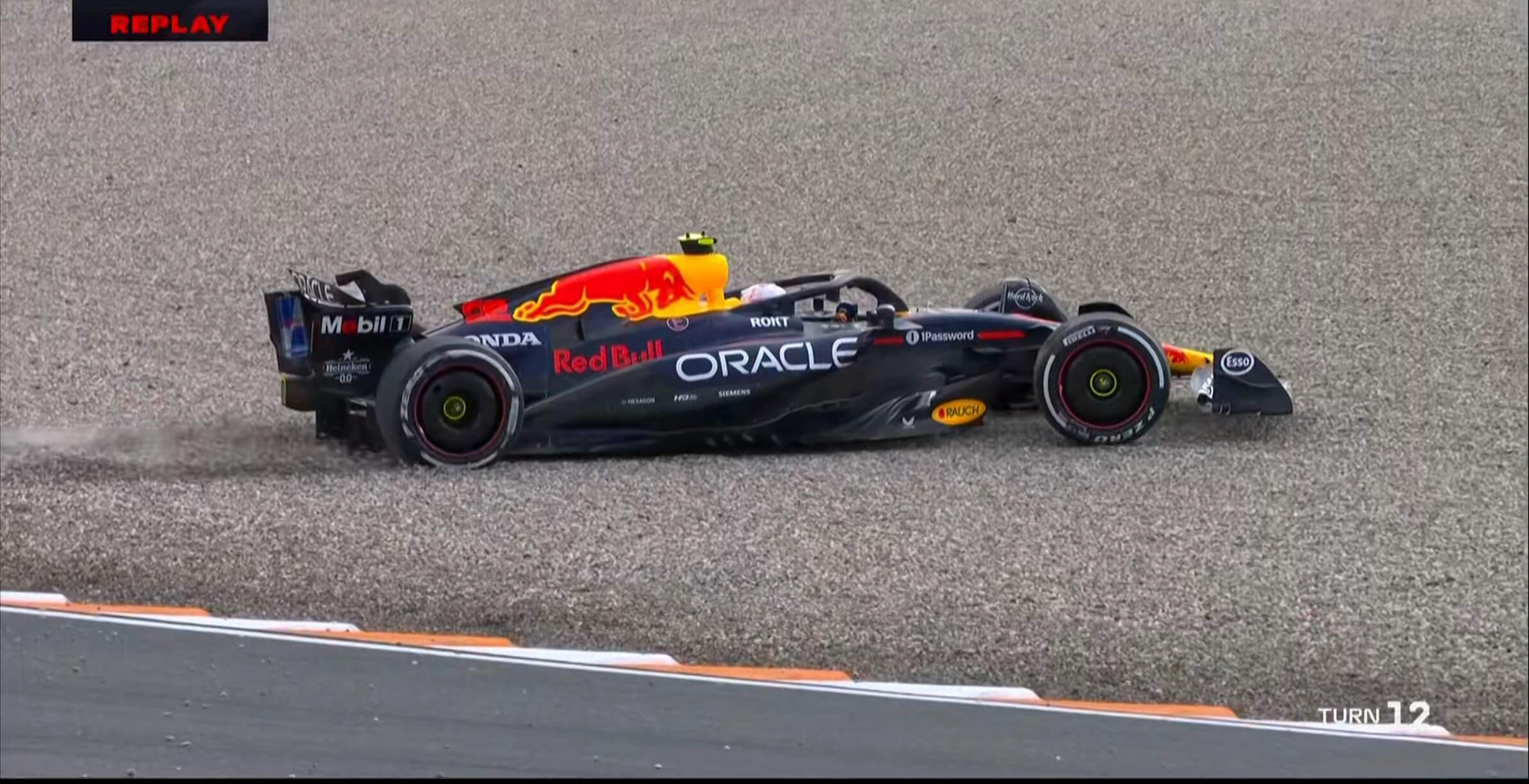 一练停表后,维斯塔潘在1号弯错过刹车点陷入砂石地,他也选择熄火后下车;
