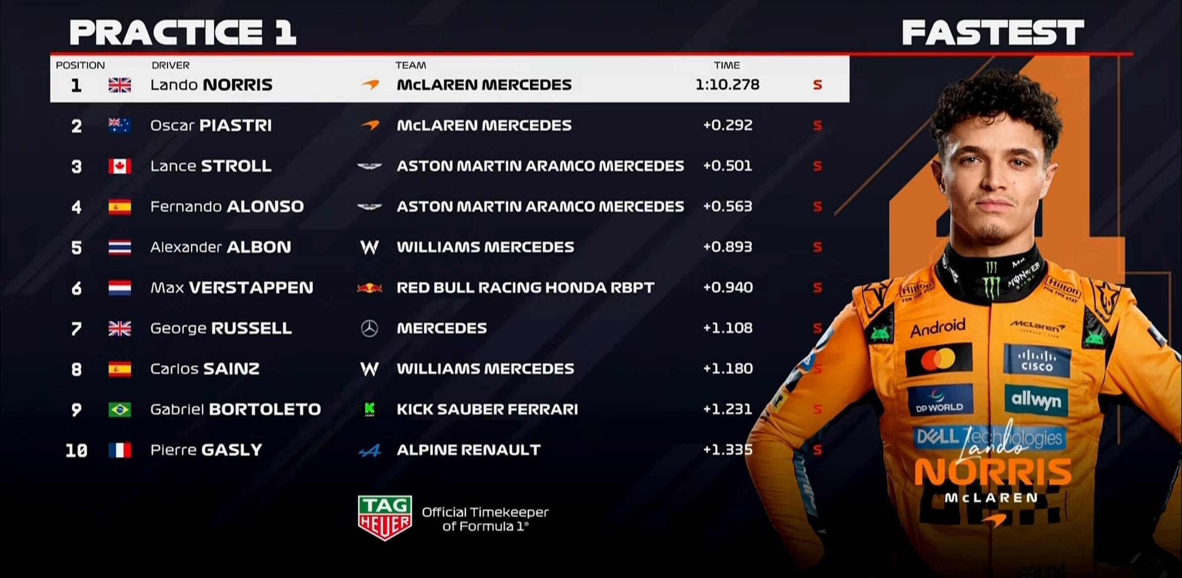 一练时间过半,诺里斯大幅刷新标杆成绩,领先队友1.5秒来到榜首!